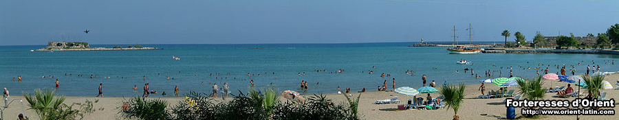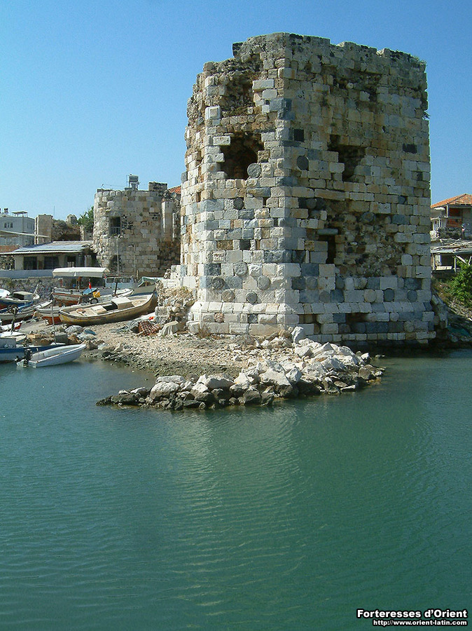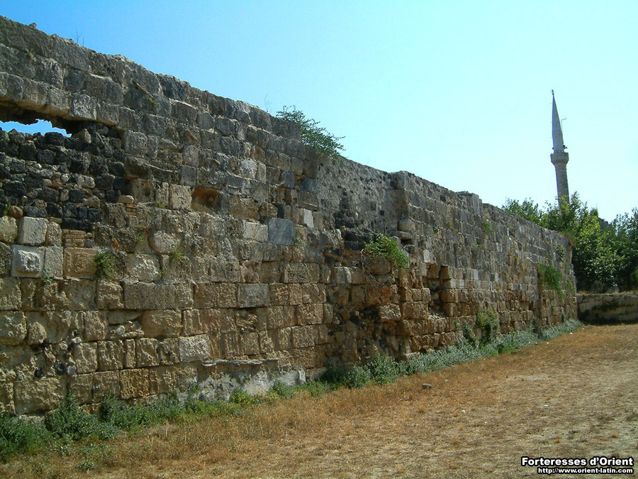La ville était puissamment défendue par deux ensembles fortifiés, sur terre et sur mer, rappelant ainsi la configuration de certains ports du Levant, tels Giblet, Sagette, Korykos ou encore Barut. Le « château de la terre » flanque l’entrée du port, tandis que le « château de la mer », aménagé sur un récif à quelques encablures de la côte face à la ville fait figure d’ouvrage défensif avancé.