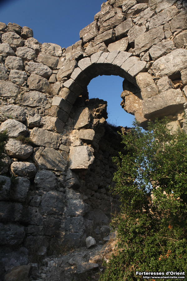 La première, aménagée dans le front est, est presque totalement ruinée. Elle était flanquée par la gauche par une petite tour. La seconde, qui ouvre vers l’ouest, est par contre très bien conservée. Le linteau qui la couvre est encore décoré d’une magnifique croix inscrite dans un cercle. Une seconde croix à gauche de la première était encore visible dans les années 80, mais l’érosion l’a depuis presque totalement effacée. Une troisième croix est ciselée sur la face extérieure du jambage gauche. La poterne est flanquée, à gauche par la courtine qui prend, à cet endroit, la forme d’un renflement saillant.