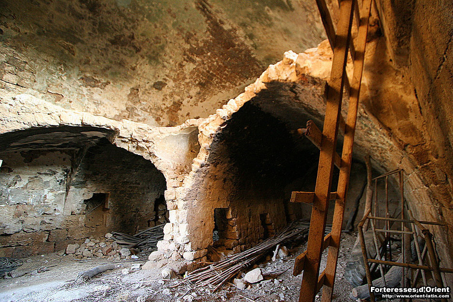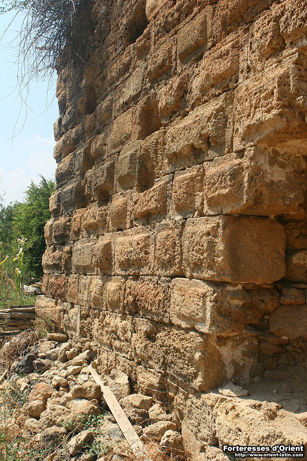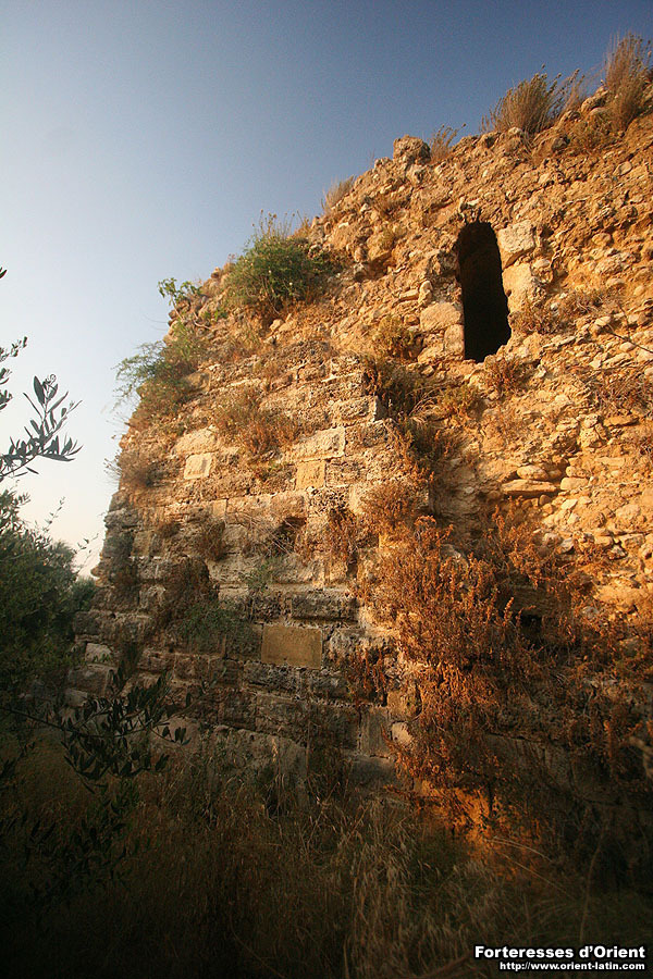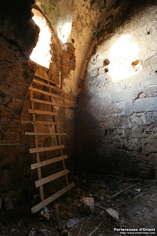 Le niveau le plus élevé est quant à lui desservi par un escalier pratiqué dans l’épaisseur du mur et dont le point d’entrée se trouve au niveau du premier étage. A cette hauteur, les parements extérieurs ont été arrachés ainsi qu’une partie de l’âme du mur. En conséquence, l’escalier est aujourd’hui à ciel ouvert et depuis l’extérieur de la tour on peut suivre sur quelques mètres la tranche de la voûte qui jadis en dessinait le conduit. Sur le toit, et comme pour l’ensemble des tours médiévales de la région à l’exception de celle de Safita, les couronnements ont tous disparus.