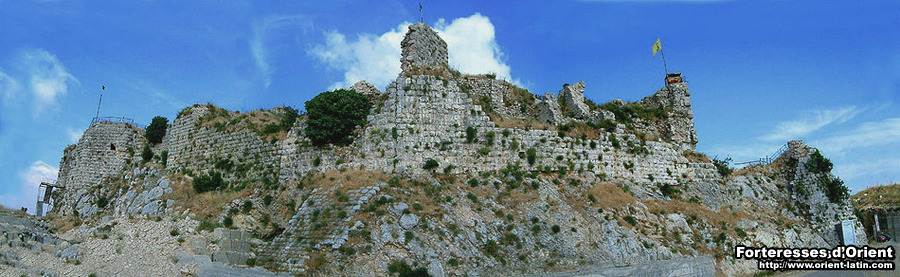 Ce dernier, retranché sur le flanc oriental de l’éperon qu’il couronne, peut être décomposé en deux sous-ensembles : une partie haute, concentrant les éléments les plus anciens de l’ensemble castral – c’est-à-dire les ouvrages francs et ayyoubides – et une partie basse plus récente ; le tout est relié par une rampe d’accès en balcon au dessus du Litani. La partie haute comprend un épais mur-bouclier ( 4 m d’épaisseur ) destiné à protéger le front sud du château des projectiles lancés par les engins de siège ; moins bien conservées sont la tour maitresse carrée qui fait corps au rempart sur le front occidental et la grand salle/chapelle construite par les Templiers, qui est, elle, totalement ruinée. A noter enfin l’existence d’une belle tour hexagonale de conception ayyoubide à la pointe nord du site.
