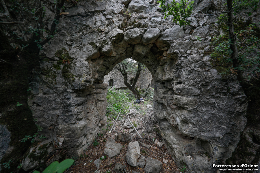 La porte est aménagée dans le front sud, qui est défendu par un à-pic naturel se déployant quelques mètres en avant. Les piédroits et l’arc de couvrement ne sont conservés que sur la face interne du fortin. Le logement de l’ancienne barre de bâclage est encore visible et, par sa position au ras du sol, atteste que le site est enfoui sous environ un mètre de remblai. Cet exhaussement du sol semble essentiellement provenir de l’accumulation de matière organique, aucun vestige de maçonnerie effondrée n’affleurant.