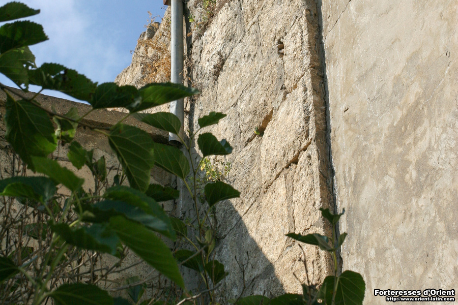 Une des maisons est particulièrement intéressante car il semble qu’une partie importante de la maçonnerie médiévale soit encore en place. Ainsi, on peut voire une arête complète formant l’angle en pierres à bossage d’une ancienne tour. Le niveau inférieur de cette structure abrite encore une voûte appareillée. L’ensemble est évidemment surchargé par des structures en parpaings et béton.