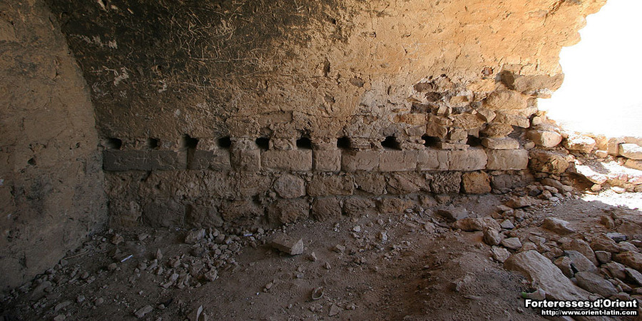 La petite salle conservée est voûtée en berçeau et donne sur une large ouverture qui semble compatible avec tous les types d’usages possibles. Dans ses proportions, cette ouverture rappelle les autres ouvertures que l’ont rencontre sur les tours franques du royaume de Jérusalem. Toutefois, une particularité retient l’attention. Il s’agit des nombreuses inscriptions qui ont été frappées sur les moellons portant la voûte. On peut se plaire à imaginer que ces symboles tournant tous autour du motif de la croix, sont les ultimes traces laissés par les pélerins d’antan.