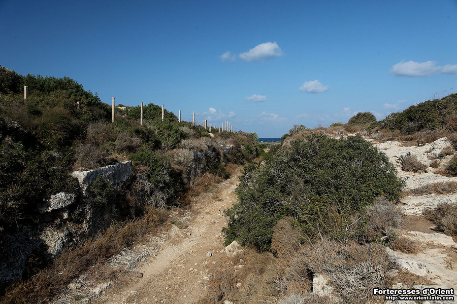 L’histoire de la tour du Détroit, appelée aussi la Pierre Encise ou encore Via Stricta dans les chroniques, est étroitement liée à celle d’un étroit corridor, passage obligé à l’époque des Croisades pour qui parcourait le littoral palestinien. Situé entre Caiffa et Césarée, là où la plaine littorale ce resserre, ce lieu consistait en un long défilé taillé dans la roche, d’une largeur de seulement quelques mètres pour une longueur de plus de deux cents environ. L’origine même de l’aménagement de ce passage semble remonter à l’Antiquité et la présence d’encoches se faisant face, dans les parois constituant les deux extrémités du conduit semble indiquer qu’il put être fermé par des portes à cette époque.