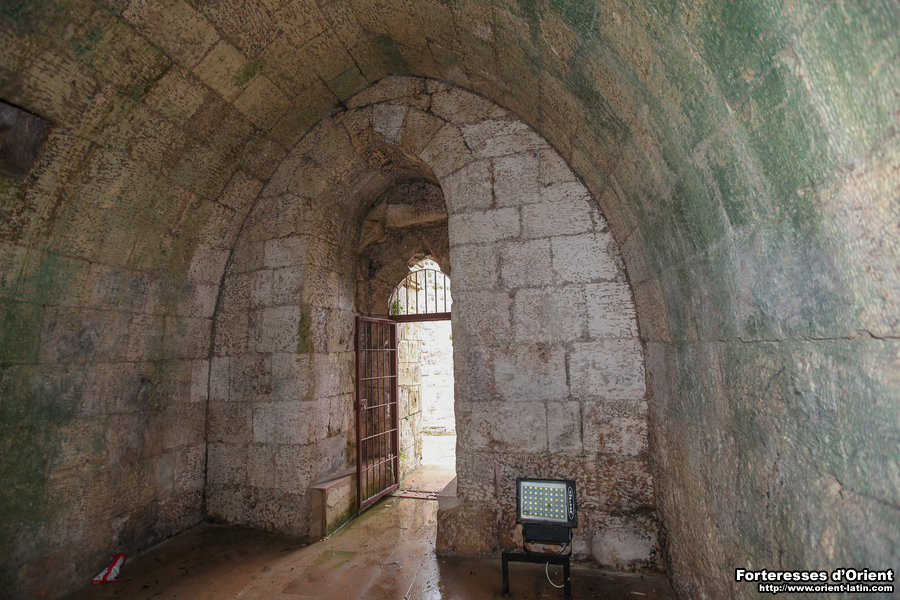 Elle donne sur une longue salle dont la voûte est renforcée par trois arcs doubleaux. A son extrémité est, une citerne a été aménagée par l’ajout d’un mur de refend, dans le cadre d’une transformation postérieure au programme initial. À l’intérieur de la citerne, on trouve de nombreuses traces d’enduit étanche au mortier de tuileau et on reconnaît le dispositif mis en place pour gérer le trop-plein, aménagé dans un ancien jour d’éclairage. Cette citerne avec trop- plein par bonde conservait les eaux collectées sur la couverture de l’édifice par l’orifice percé dans la voûte, par lequel on tirait aussi probablement l’eau.