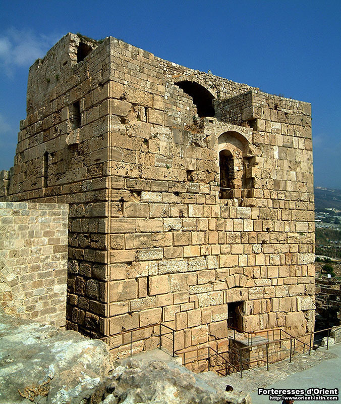 Le château de Giblet – sans doute l’un des plus anciens construits par les Croisés – présente la particularité d’être situé au sein d’un vaste champ de ruines archéologiques, où se mêlent, face à la Méditerranée, les vestiges laissés par les plus grandes civilisations de l’Antiquité. On suppose que ce fut là, au contact de monuments perses pourvus d’appareil à bossage, que les Francs adoptèrent cette technique qui deviendra tout au long du XII° siècle leur « marque de fabrique » pour la construction d’ouvrages militaires. D’où la présence de ces imposantes pierres à bossage tabulaire sur l’ensemble de l’édifice mais également de ces fûts de colonne placés en boutisse, eux aussi réemployés à bon escient.