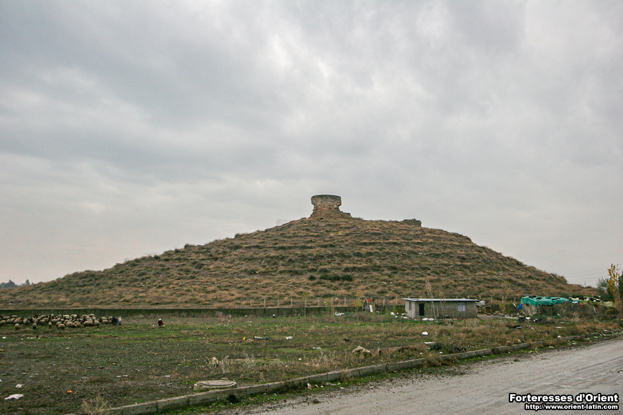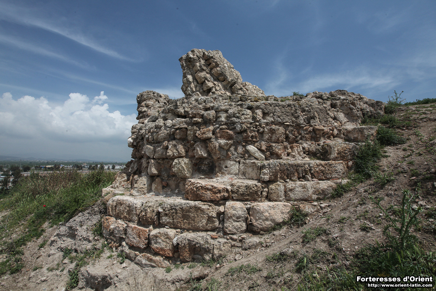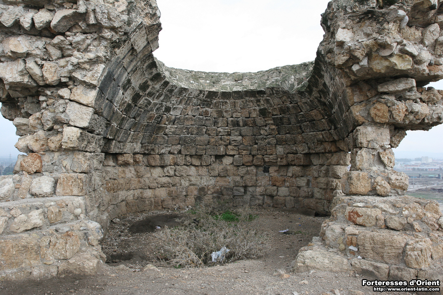 Malgré l’état très lacunaire des vestiges, ces variations indiquent une conception globale de l’ouvrage qui s’affranchit de toute symétrie et de toute régularité pour s’adapter à son contexte, c’est-à-dire en l’occurrence essentiellement à son orientation. La saillie importante de la tour NE pourrait se justifier en relation avec la route que l’ouvrage est supposé contrôler. La voûte portait probablement un étage supérieur surmonté d’une terrasse découvrant la plaine. La tour peut aussi être envisagée en relation avec la porte de l’ouvrage, qu’elle pourrait avoir contribué à protéger. Il faudrait alors l’imaginer percée dans la courtine est. En l’état actuel des vestiges, on ne peut aller plus loin dans cette hypothèse, alors que les pentes du tell ne livrent aucun indice quant à la position d’un éventuel chemin d’accès.