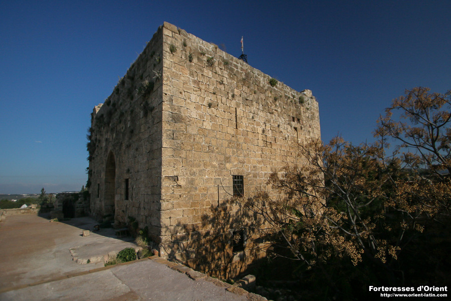 L’enceinte extérieure, réalisée à la manière des châteaux Francs dits de halle-sans-fin, comme à Qalaat Umm Hosh ou Coliath, avec ses espaces voûtés en berceau multi-fonctionnels le long des ailes ouest, nord et est, et son parapet percé d’archères sous niche, semble plus clairement d’origine franque. Sa grande porte à assommoir portait un linteau frappé d’une croix à double barre transversale dont les dernières traces ont malheureusement très mal supportées le récent nettoyage des parements. Il n’est plus possible aujourd’hui d’en distinguer précisément les contours.