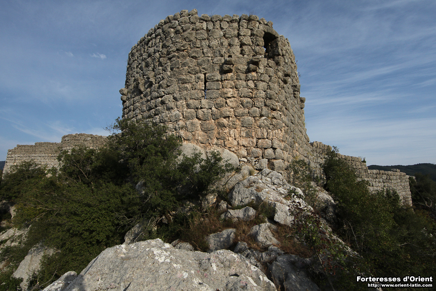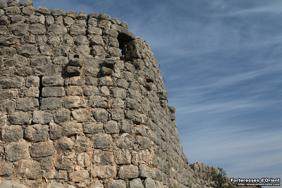 L’ouvrage le plus remarquable de l’ensemble est la grande tour qui est positionnée à l’articulation entre le front sud et le grand front est. Son rez-de-chaussée est formé de deux salles accolées servant chacune de citerne. Au premier étage, un ensemble de quatre ébrasements simples fournis des éléments rudimentaires de défense active. Deux petites portes pratiquées au-dessus de ces archères permettaient de rejoindre un balcon en bois qui reposait extérieurement sur une série de consoles encore largement conservées. La nature et la fonction exacte de ce dispositif n’est pas déterminée.