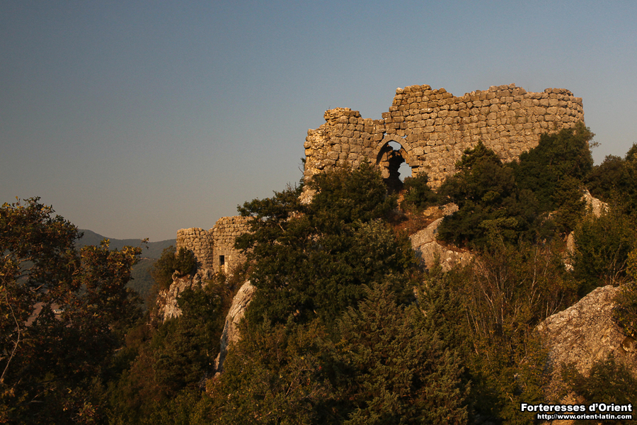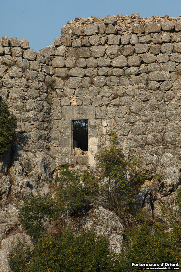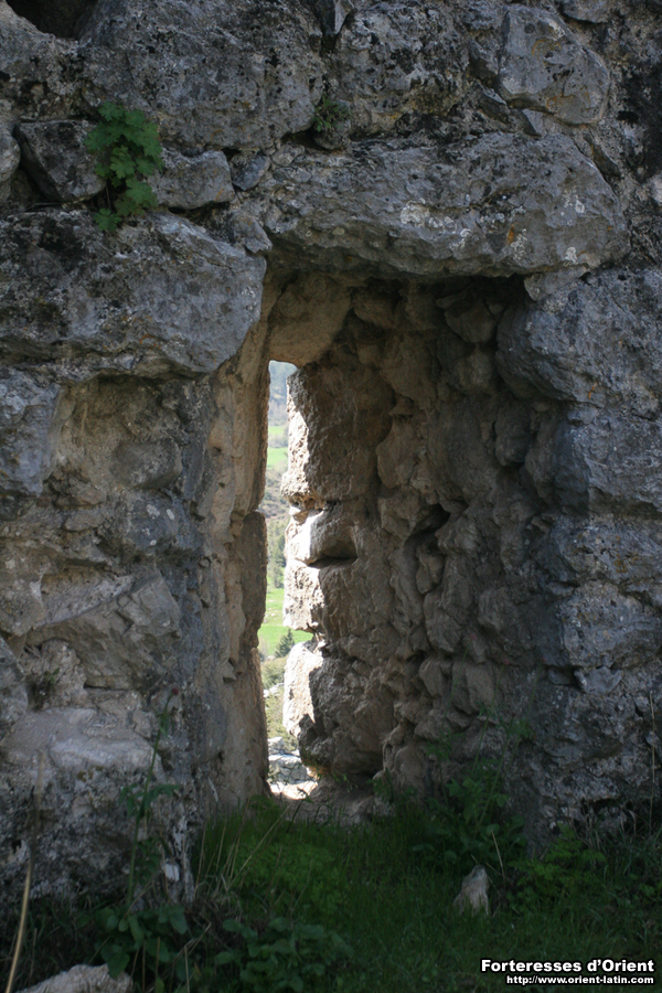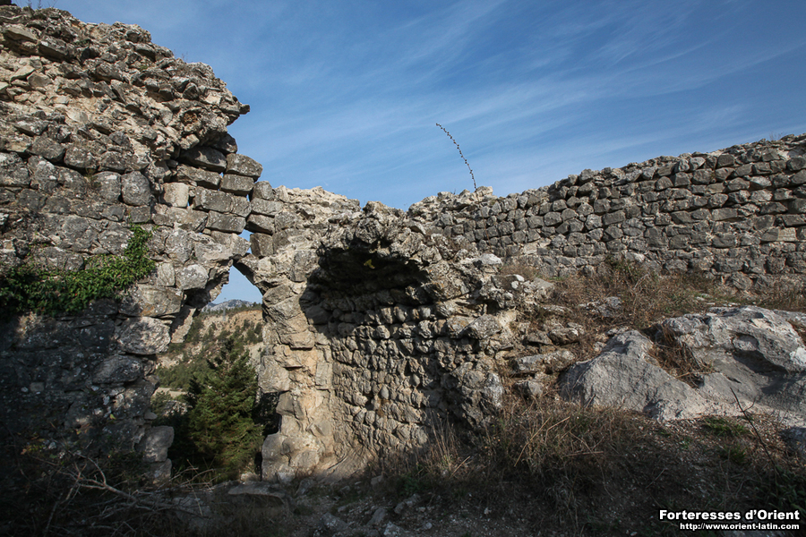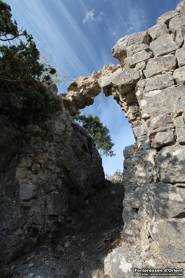 La première, aménagée dans le front est, est presque totalement ruinée. Elle était flanquée par la gauche par une petite tour. La seconde, qui ouvre vers l’ouest, est par contre très bien conservée. Le linteau qui la couvre est encore décoré d’une magnifique croix inscrite dans un cercle. Une seconde croix à gauche de la première était encore visible dans les années 80, mais l’érosion l’a depuis presque totalement effacée. Une troisième croix est ciselée sur la face extérieure du jambage gauche. La poterne est flanquée, à gauche par la courtine qui prend, à cet endroit, la forme d’un renflement saillant.