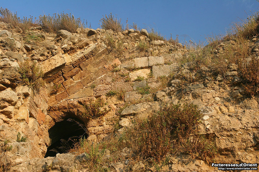 Le niveau le plus élevé est quant à lui desservi par un escalier pratiqué dans l’épaisseur du mur et dont le point d’entrée se trouve au niveau du premier étage. A cette hauteur, les parements extérieurs ont été arrachés ainsi qu’une partie de l’âme du mur. En conséquence, l’escalier est aujourd’hui à ciel ouvert et depuis l’extérieur de la tour on peut suivre sur quelques mètres la tranche de la voûte qui jadis en dessinait le conduit. Sur le toit, et comme pour l’ensemble des tours médiévales de la région à l’exception de celle de Safita, les couronnements ont tous disparus.