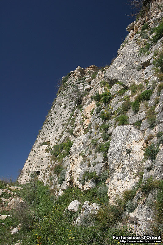 Ce dernier, retranché sur le flanc oriental de l’éperon qu’il couronne, peut être décomposé en deux sous-ensembles : une partie haute, concentrant les éléments les plus anciens de l’ensemble castral – c’est-à-dire les ouvrages francs et ayyoubides – et une partie basse plus récente ; le tout est relié par une rampe d’accès en balcon au dessus du Litani. La partie haute comprend un épais mur-bouclier ( 4 m d’épaisseur ) destiné à protéger le front sud du château des projectiles lancés par les engins de siège ; moins bien conservées sont la tour maitresse carrée qui fait corps au rempart sur le front occidental et la grand salle/chapelle construite par les Templiers, qui est, elle, totalement ruinée. A noter enfin l’existence d’une belle tour hexagonale de conception ayyoubide à la pointe nord du site.