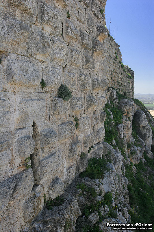 Ce dernier, retranché sur le flanc oriental de l’éperon qu’il couronne, peut être décomposé en deux sous-ensembles : une partie haute, concentrant les éléments les plus anciens de l’ensemble castral – c’est-à-dire les ouvrages francs et ayyoubides – et une partie basse plus récente ; le tout est relié par une rampe d’accès en balcon au dessus du Litani. La partie haute comprend un épais mur-bouclier ( 4 m d’épaisseur ) destiné à protéger le front sud du château des projectiles lancés par les engins de siège ; moins bien conservées sont la tour maitresse carrée qui fait corps au rempart sur le front occidental et la grand salle/chapelle construite par les Templiers, qui est, elle, totalement ruinée. A noter enfin l’existence d’une belle tour hexagonale de conception ayyoubide à la pointe nord du site.