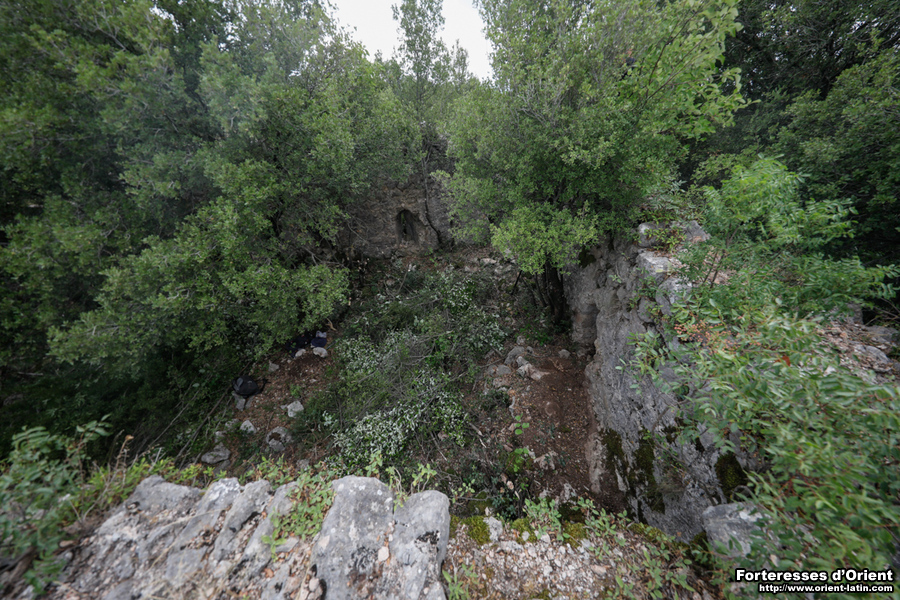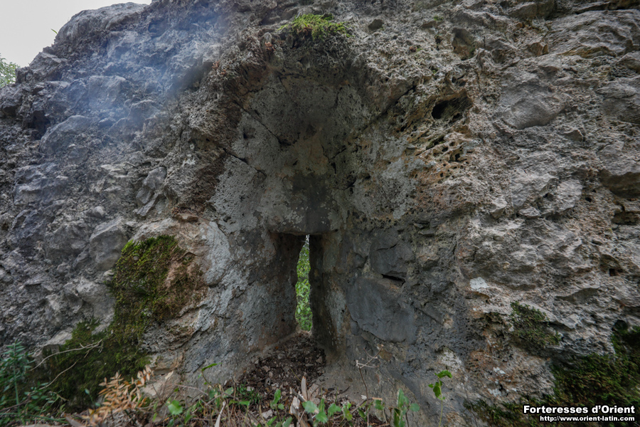 La porte est aménagée dans le front sud, qui est défendu par un à-pic naturel se déployant quelques mètres en avant. Les piédroits et l’arc de couvrement ne sont conservés que sur la face interne du fortin. Le logement de l’ancienne barre de bâclage est encore visible et, par sa position au ras du sol, atteste que le site est enfoui sous environ un mètre de remblai. Cet exhaussement du sol semble essentiellement provenir de l’accumulation de matière organique, aucun vestige de maçonnerie effondrée n’affleurant.