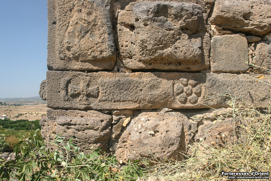 Les maitres d’œuvre ont intégrés ponctuellement quelques éléments d’architecture antique probablement trouvés sur place. On retiendra notamment un linteau byzantin en basalte sculpté de la porte principale, quelques croix pattées et un sarcophage engagé à la base de l’angle nord-ouest de la tour.