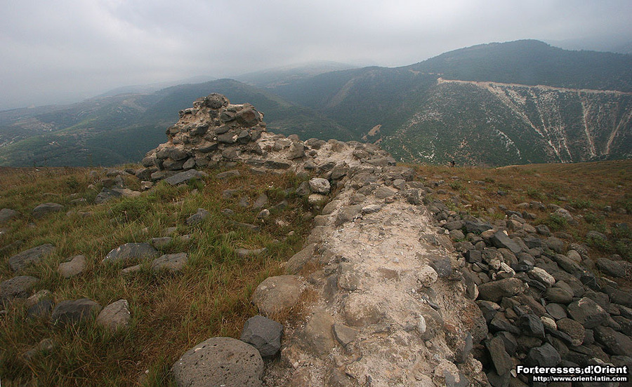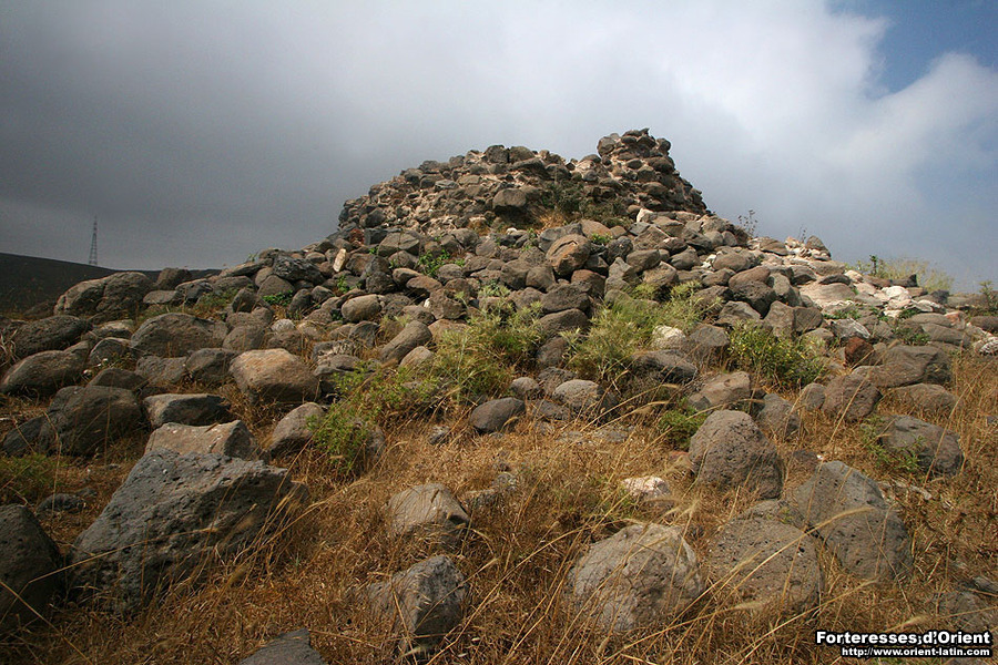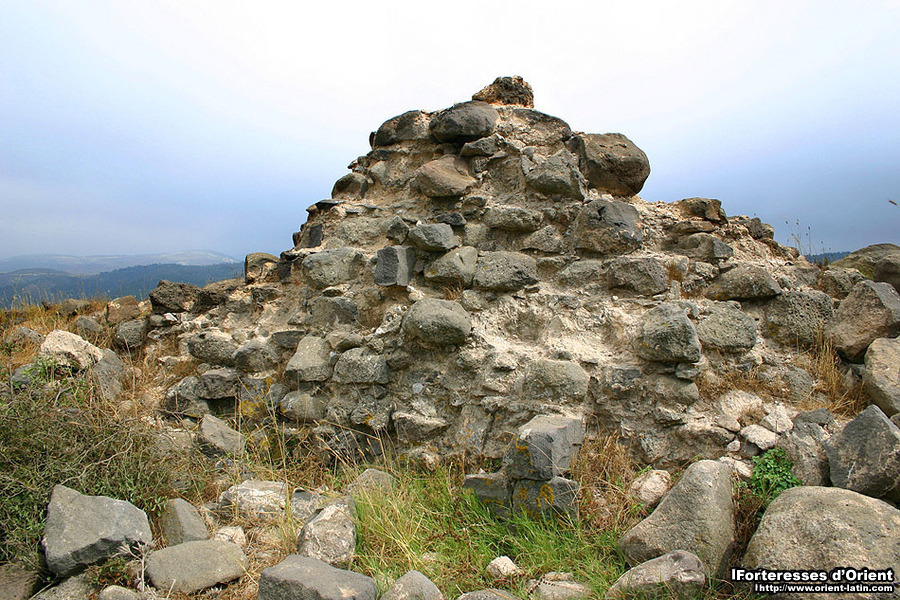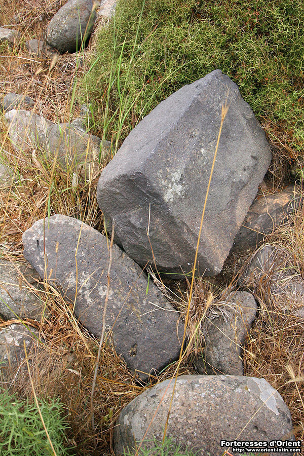 Par ailleurs, les restes de plusieurs meules en basalte dispersées sur la croupe rocheuse semblent attester de l’exploitation agricole du lieu à l’époque byzantine, et il est alors fort probable que les Francs se soient contentés de fortifier un hameau préexistant.