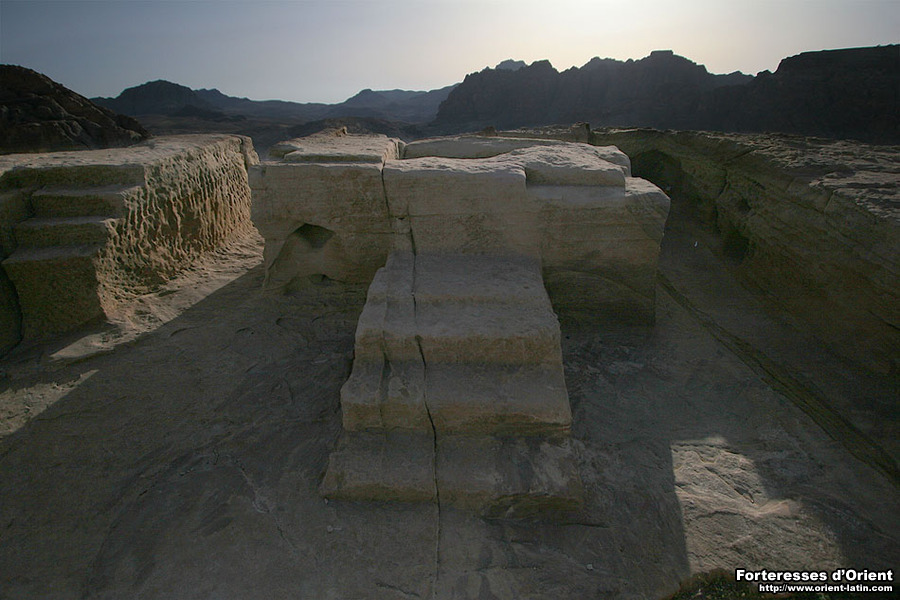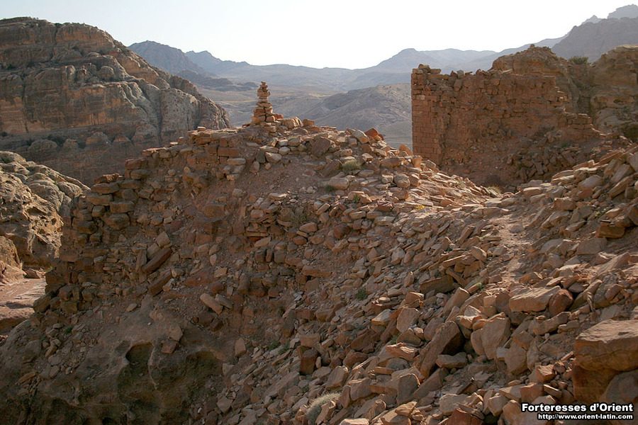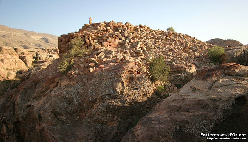Il en va ainsi de la région du Wadi Musa, particulièrement riche en positions de cet ordre. Si les ruines d’al-Wuaria correspondent sans aucun doute possible aux murailles du Val Moyse franc, si les courtines ceinturant la colline d’al-Habis semblent correspondre au fortin du même nom, le s vestiges couronnant le Jebel al-Madhba – aujourd’hui connu sous le nom de “Haut Lieu du Sacrifice” – n’ont toujours pas fait l’objet d’étude digne de ce nom.