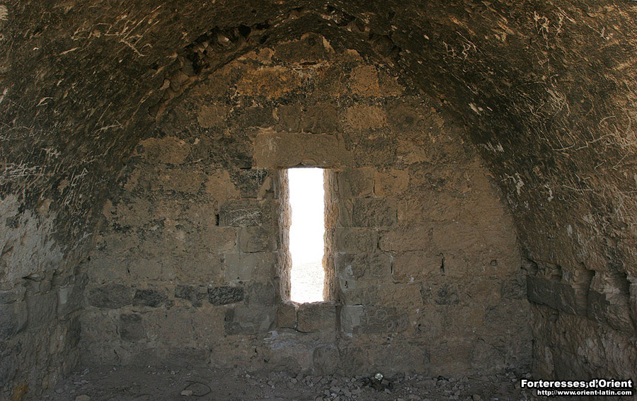 La petite salle conservée est voûtée en berçeau et donne sur une large ouverture qui semble compatible avec tous les types d’usages possibles. Dans ses proportions, cette ouverture rappelle les autres ouvertures que l’ont rencontre sur les tours franques du royaume de Jérusalem. Toutefois, une particularité retient l’attention. Il s’agit des nombreuses inscriptions qui ont été frappées sur les moellons portant la voûte. On peut se plaire à imaginer que ces symboles tournant tous autour du motif de la croix, sont les ultimes traces laissés par les pélerins d’antan.