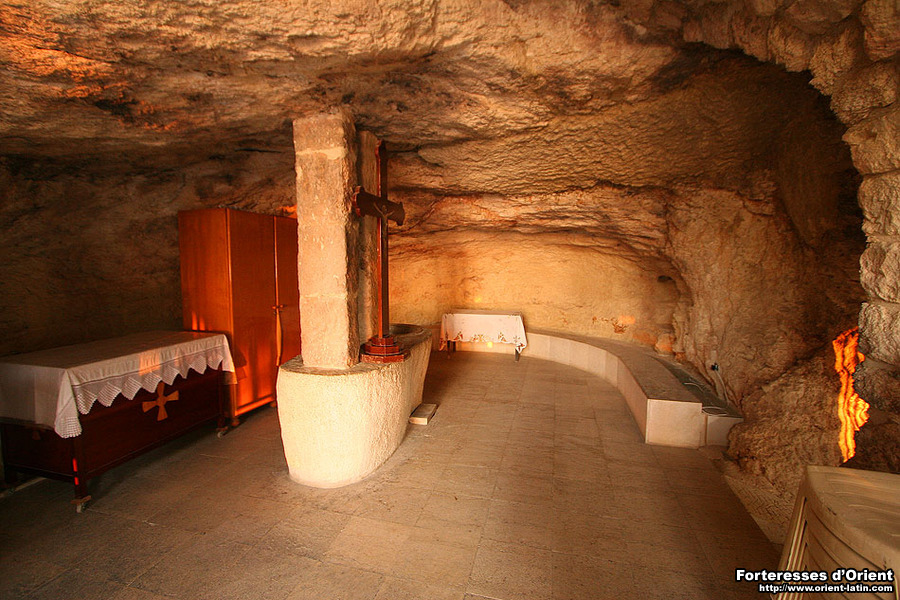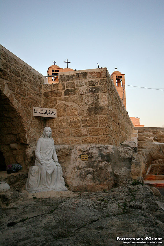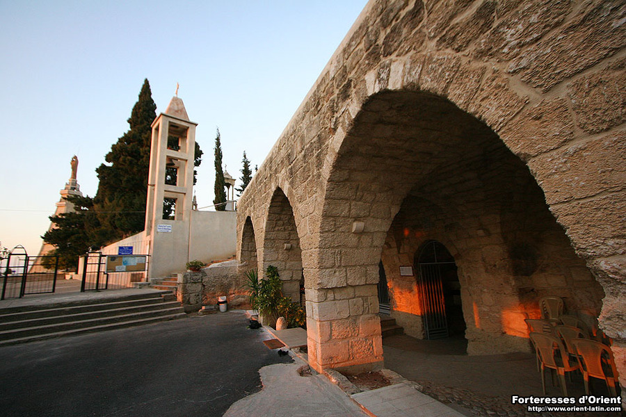 A seulement deux kilomètres de Sagette, sur une éminence du haut de laquelle on jouit d’une vue imprenable sur tout le littoral, s’élevait jadis la forteresse de Franche Garde. Le site, aujourd’hui connu sous le nom de Qasr al-Mantara , a bien vite été éclipsé par son célèbre et – trop – proche voisin, Maghdouché. Des grottes, aujourd’hui aménagées en une petite église, se trouvent en effet aux pieds de l’emplacement de l’ancienne citadelle. Elles auraient servi d’abri à la vierge Marie lorsque celle-ci attendait le retour du Christ alors en prêche dans la région. Autant dire que le lieu fut toujours vénéré par les populations chrétiennes locales et est aujourd’hui l’objet d’une ferveur toute particulière.