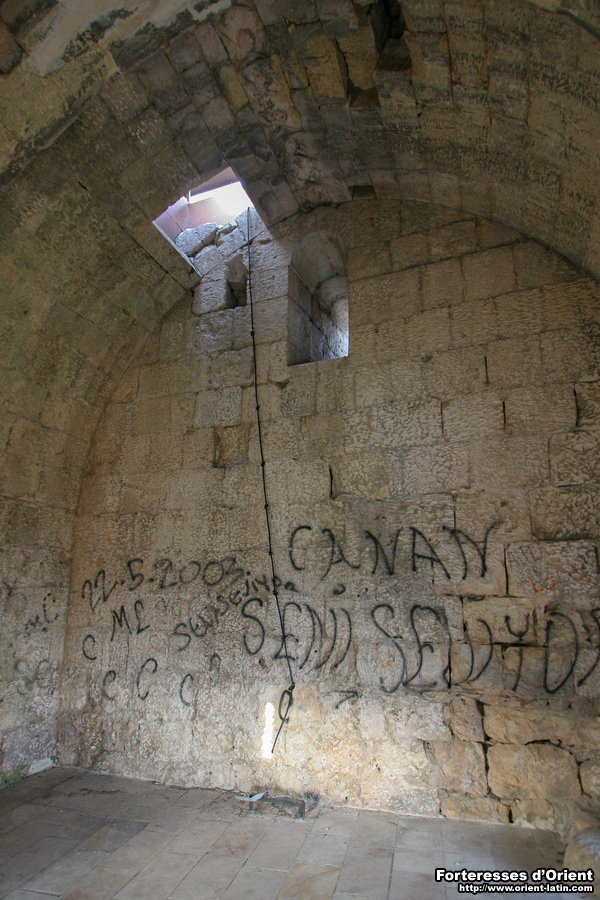On gagnait l’étage supérieur par une trémie dont l’encadrement est conservé. Cette mesure, qui peut paraître surprenante, est sûrement à considérer sous l’angle de la sécurité, l’idée étant certainement de pouvoir interdire l’accès aux étages de la tour en calfeutrant l’ouverture en cas de prise du rez-de-chaussée.