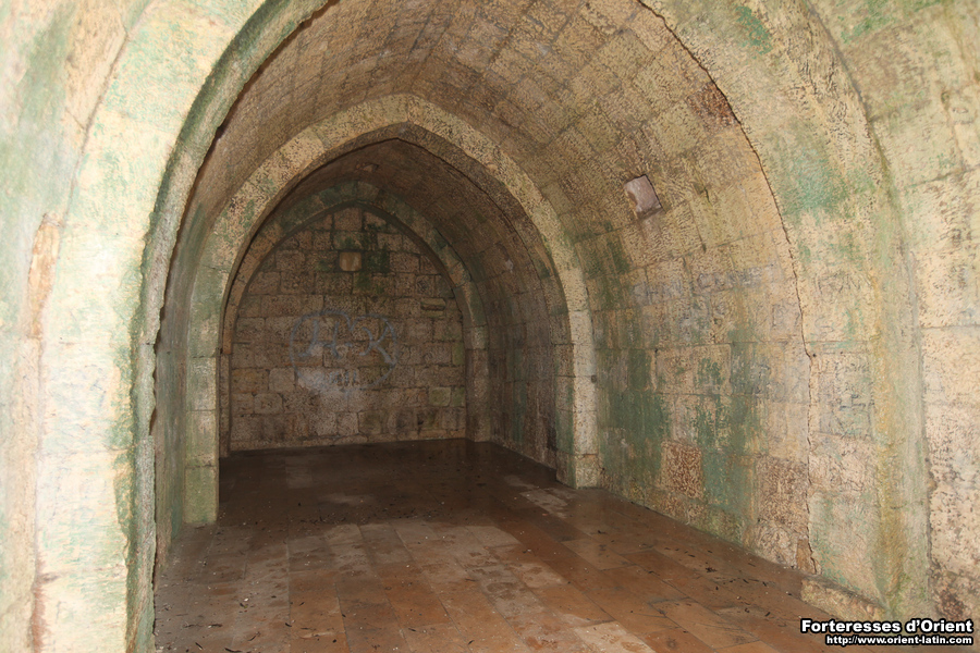 Elle donne sur une longue salle dont la voûte est renforcée par trois arcs doubleaux. A son extrémité est, une citerne a été aménagée par l’ajout d’un mur de refend, dans le cadre d’une transformation postérieure au programme initial. À l’intérieur de la citerne, on trouve de nombreuses traces d’enduit étanche au mortier de tuileau et on reconnaît le dispositif mis en place pour gérer le trop-plein, aménagé dans un ancien jour d’éclairage. Cette citerne avec trop- plein par bonde conservait les eaux collectées sur la couverture de l’édifice par l’orifice percé dans la voûte, par lequel on tirait aussi probablement l’eau.