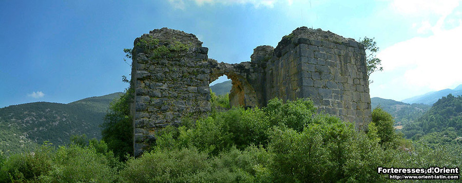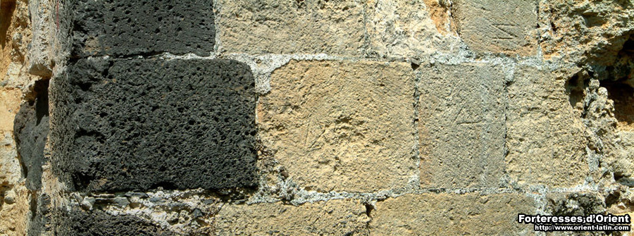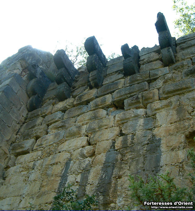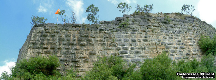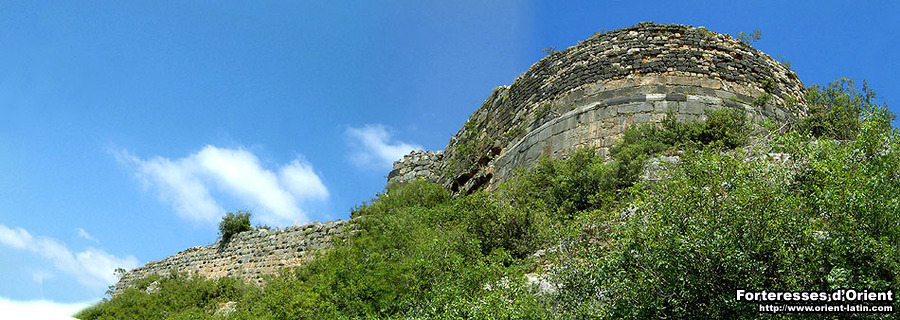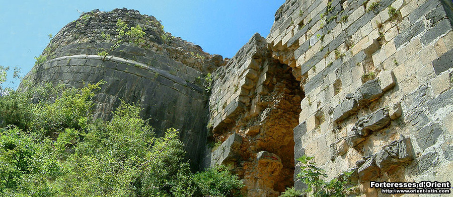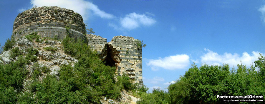 Seul un nombre limité d’ouvrages se détachent de la courtine qui forme une enceinte unique. Le principal est un puissant donjon semi-circulaire défendant le front d’attaque et commandant la porterie. Cette porterie porte de nombreuses marque de tâcherons et est munie d’une herse, procédé peu pratiqué au Moyen-Orient qui permet très certainement de l’attribuer aux teutoniques.