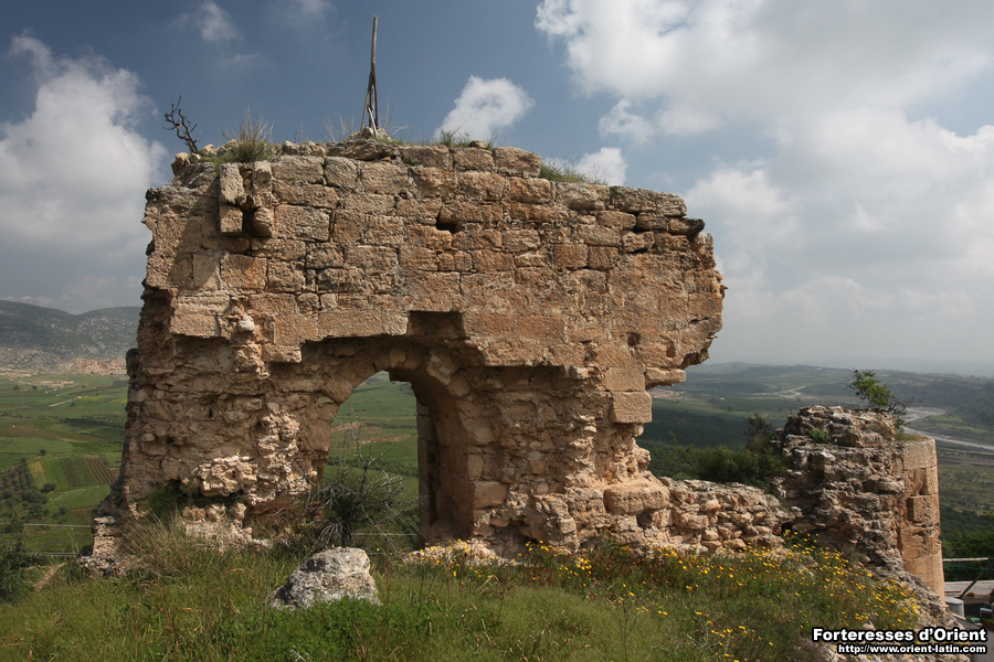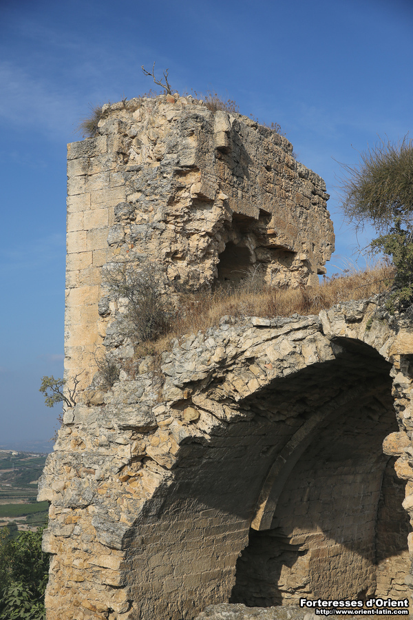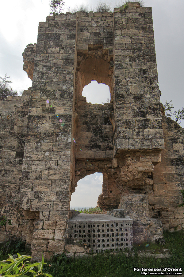 Le premier étage est, lui, presque entièrement ruiné. Il ne reste qu’un fragment du mur nord dans lequel a été percé la baie qui permettait de servir l’assommoir. Un étrier conservé atteste du fait que ce niveau bénéficiait d’un programme d’archères à niches.