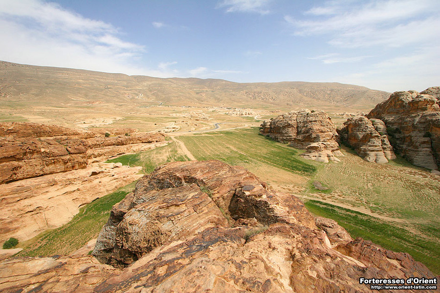 Surplombant la plaine, un second niveau est accessible via un chemin tortueux épousant les facéties du rocher. Ce petit plateau, situé plus d’une cinquantaine de mètres en hauteur, offre une magnifique vue sur la vallée et les couleurs vives des sommets qui l’ensèrent. Partout le sol est jonché de pierres qui semblent jadis avoir été taillées et assemblées, bien que l’érosion et les tremblements de terre les aient depuis longtemps jetées à terre. Toutefois, les analyses de poteries semblent formelles et l’occupation médiévale du site n’est plus à contester. Un troisième niveau, plus en hauteur et en retrait, est quant à lui accessible par un autre chemin, taillé contre la falaise. Cette vaste étendue plane a probablement servi de carrière pour lever les murs d’Hormuz. Des aménagements semblent aussi attester de l’utilisation de cette vaste surface comme outil de recueil des eaux.