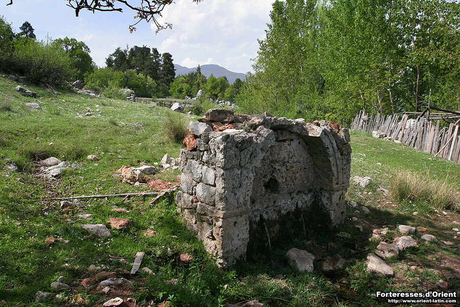En contrebas du site choisi pour édifier le fort, une fontaine maçonnée pourrait bien être un autre vestige de ce moyen-âge florissant. Finement appareillée, l’eau y est encore vive et il est impossible de ne pas rapprocher cet ouvrage d’autres, similaires, que l’on rencontre en Cilicie Trachée par exemple.
