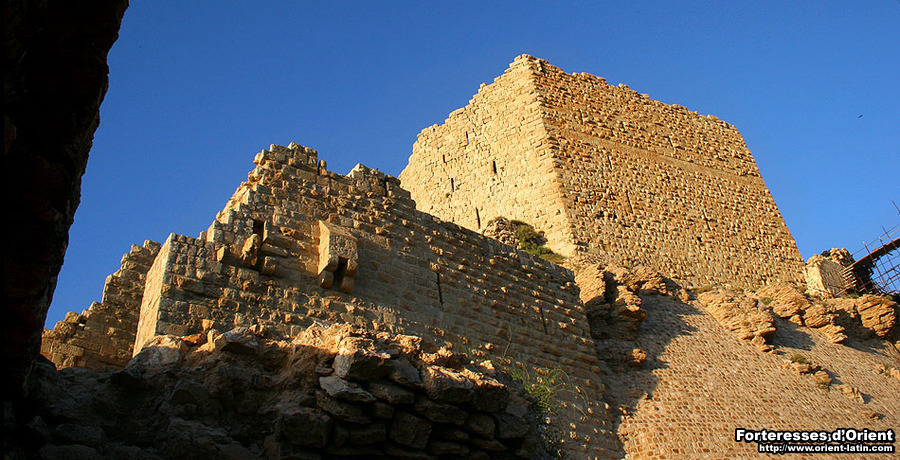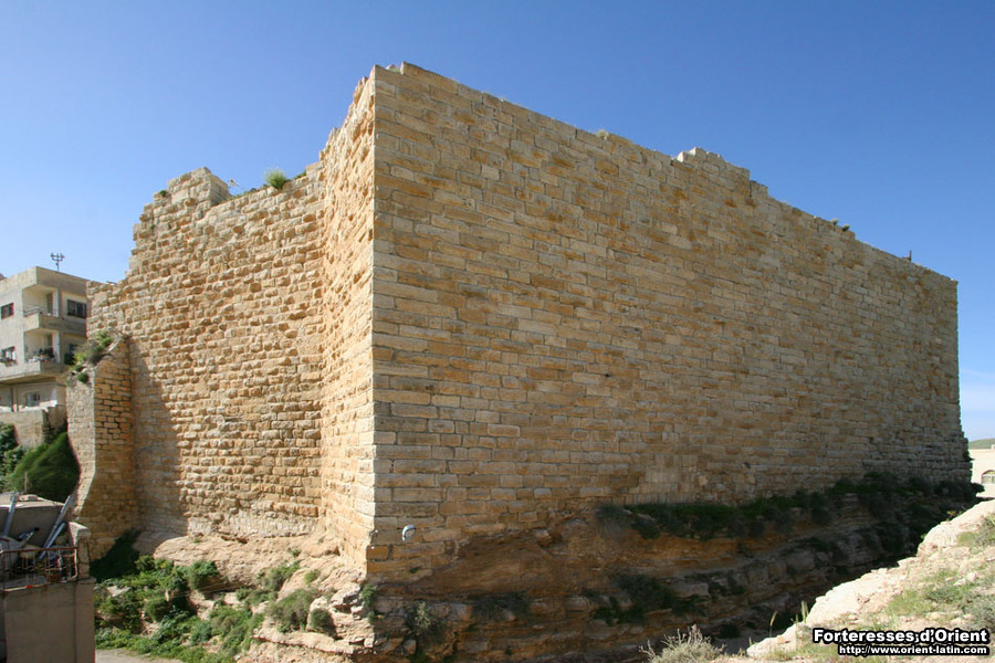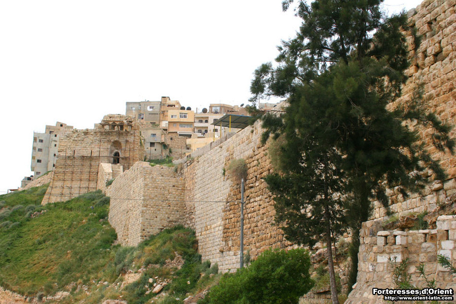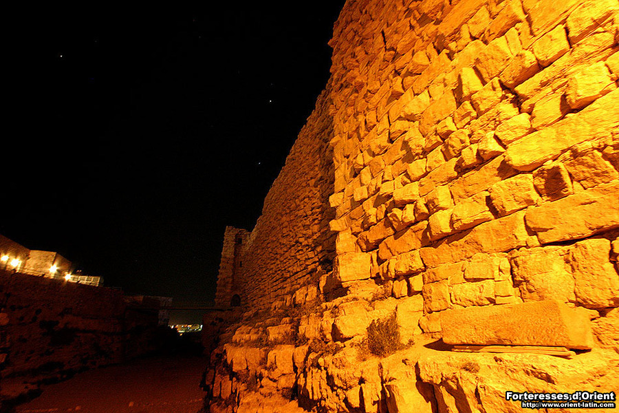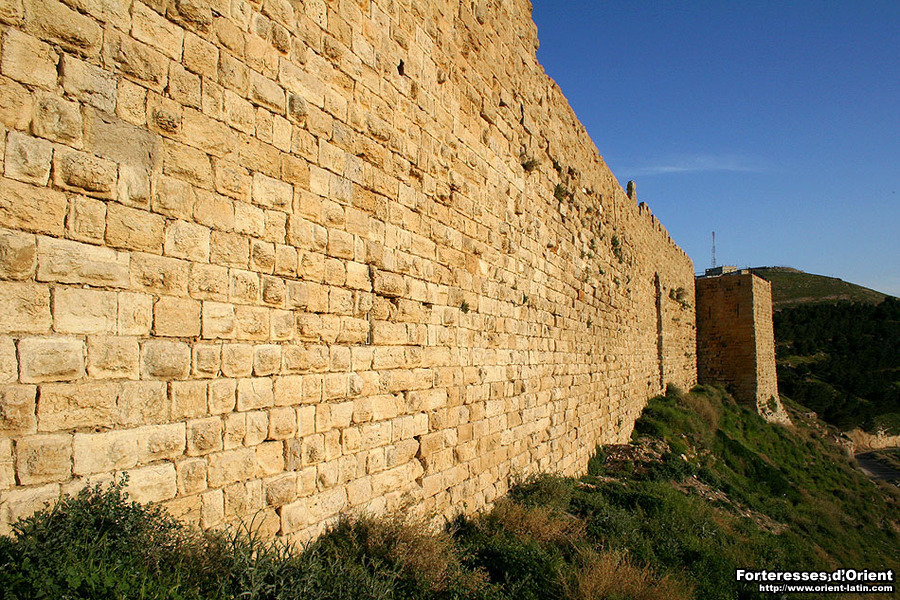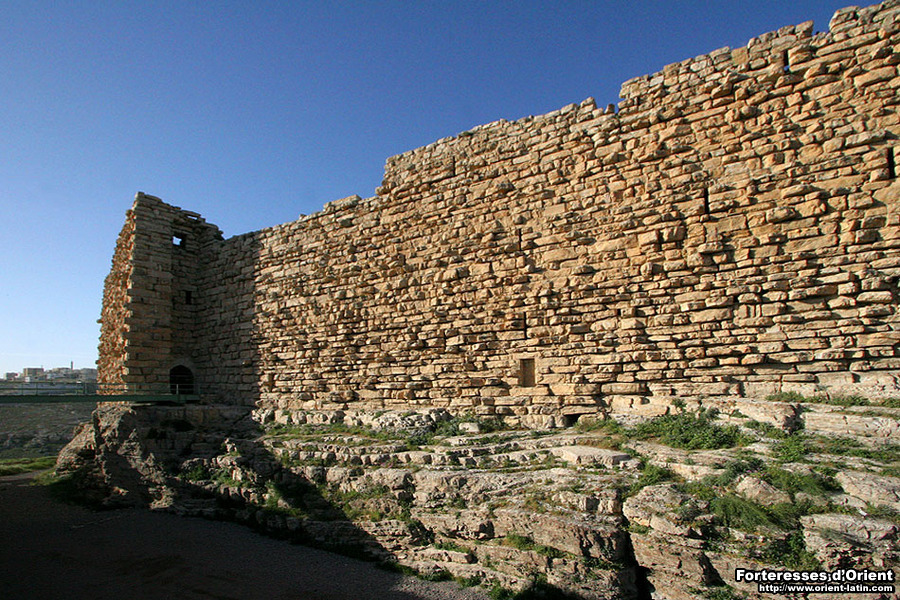 Le front nord du château, précisément celui qui fait face à la ville, consiste en un gigantesque mur bouclier, héritage franc composé de pierres d’un brun sombre à peine dégrossies (on reconnait aisément le travail franc sur tout le pourtour du château, ces derniers ayant utilisé cette fameuse pierre brune d’une dureté extrême, typique de la région de Kérak).