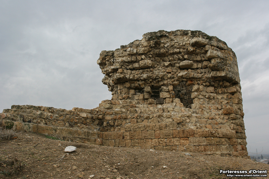 Malgré l’état très lacunaire des vestiges, ces variations indiquent une conception globale de l’ouvrage qui s’affranchit de toute symétrie et de toute régularité pour s’adapter à son contexte, c’est-à-dire en l’occurrence essentiellement à son orientation. La saillie importante de la tour NE pourrait se justifier en relation avec la route que l’ouvrage est supposé contrôler. La voûte portait probablement un étage supérieur surmonté d’une terrasse découvrant la plaine. La tour peut aussi être envisagée en relation avec la porte de l’ouvrage, qu’elle pourrait avoir contribué à protéger. Il faudrait alors l’imaginer percée dans la courtine est. En l’état actuel des vestiges, on ne peut aller plus loin dans cette hypothèse, alors que les pentes du tell ne livrent aucun indice quant à la position d’un éventuel chemin d’accès.