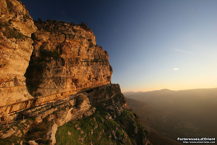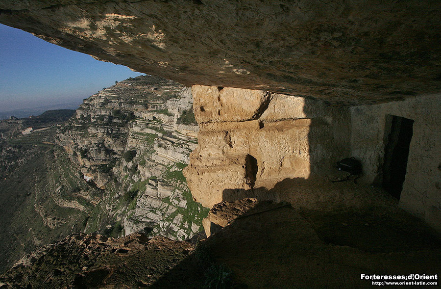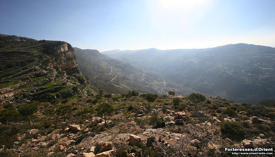 A chaque endroit, que ce soit depuis les chambres ou depuis la corniche, la vue porte jusqu’à la mer. On aperçoit distinctement l’endroit où le Nahr al-Barouk rejoint le Wadi Jezzin pour former le Nahr al-Aouali , celui-là même qui, quelques kilomètres plus loin, est défendu par le fort de Belhacem. C’est bien la ville de Saïda qui ferme l’horizon et l’on comprend alors pourquoi cette position, pourtant orientée vers l’intérieur des territoires francs, pût être stratégique à leurs yeux.
