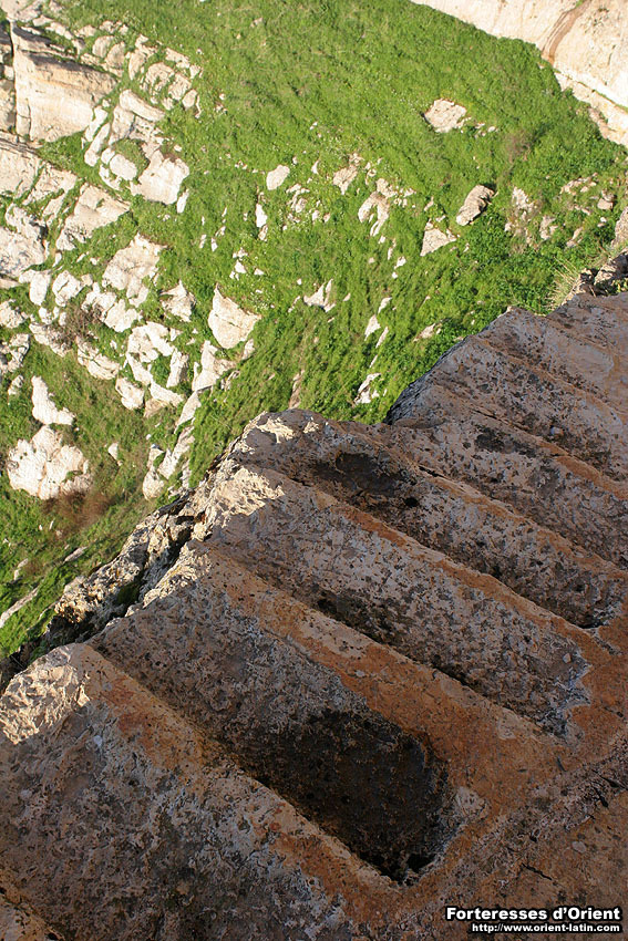 En arrivant à hauteur des premières salles taillées dans la roche, on remarque que le passage, alors en forte pente, a été aménagé sur son extérieur. Deux envolées de marches sont encore visibles. Toutefois, la proximité du ravin incitera le visiteur a ne pas tenter de les utiliser!