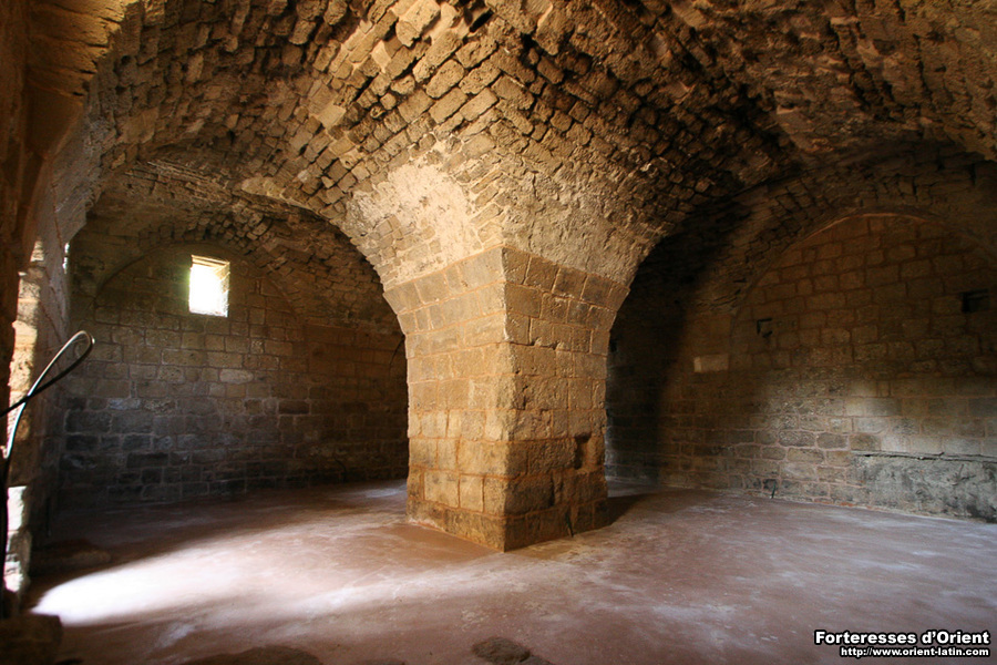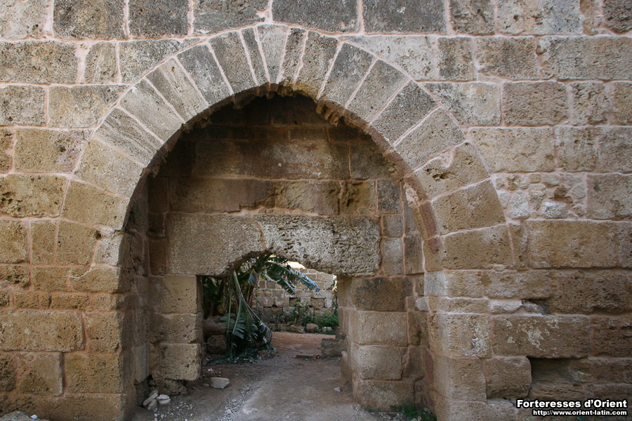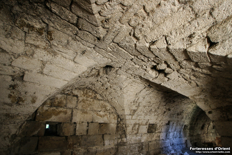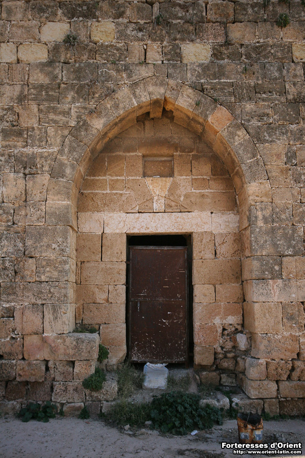 L’enceinte extérieure, réalisée à la manière des châteaux Francs dits de halle-sans-fin, comme à Qalaat Umm Hosh ou Coliath, avec ses espaces voûtés en berceau multi-fonctionnels le long des ailes ouest, nord et est, et son parapet percé d’archères sous niche, semble plus clairement d’origine franque. Sa grande porte à assommoir portait un linteau frappé d’une croix à double barre transversale dont les dernières traces ont malheureusement très mal supportées le récent nettoyage des parements. Il n’est plus possible aujourd’hui d’en distinguer précisément les contours.