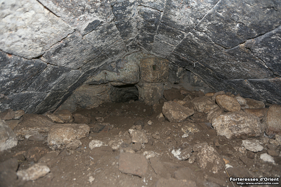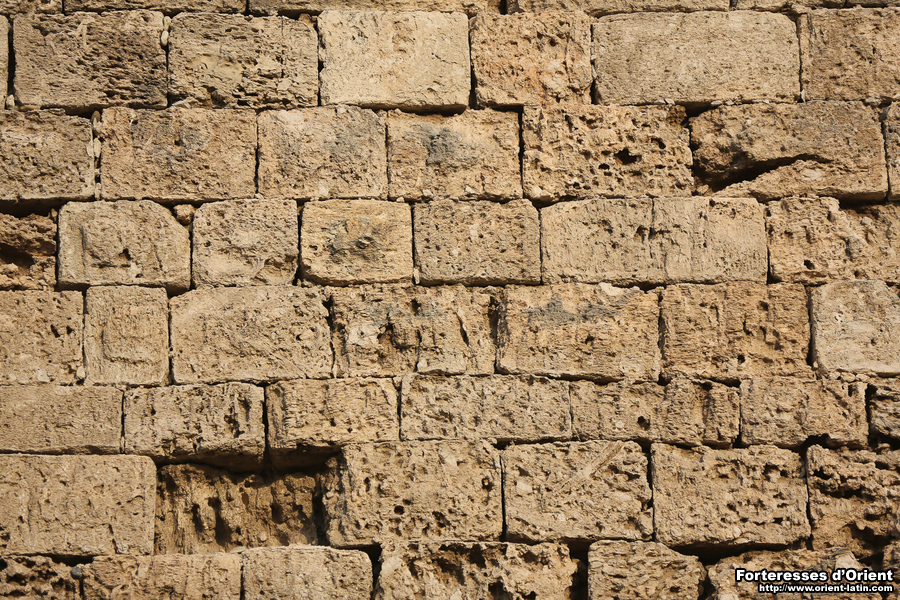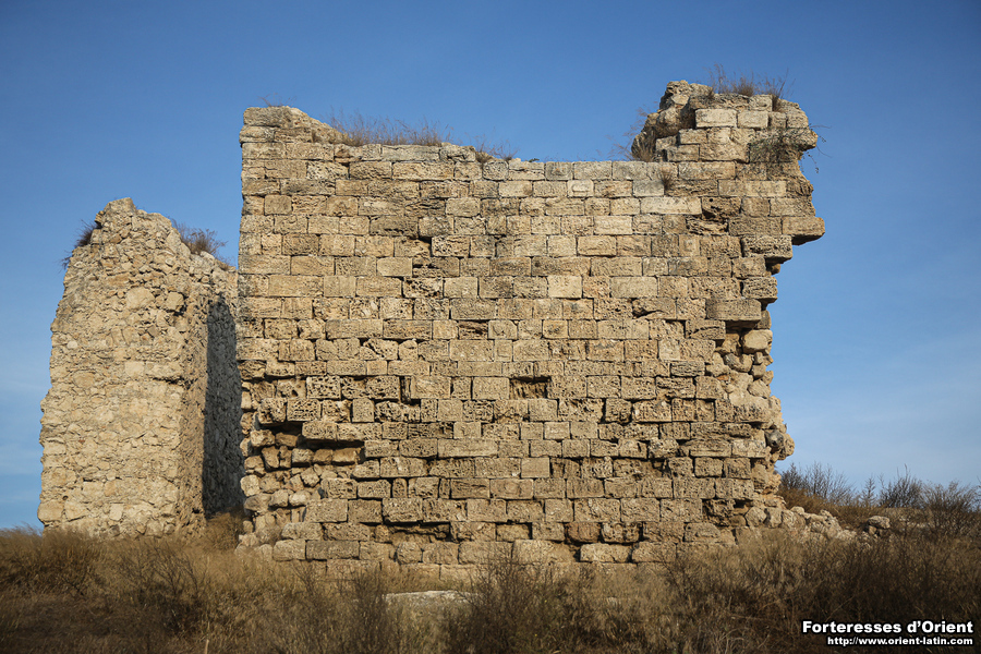 Dans un deuxième temps, les trois tourelles du front E ont été enveloppées par une nouvelle maçonnerie, dont on conserve aujourd’hui les assises inférieures. Cette campagne de renforcement indique, à l’évidence, le statut privilégié du front est : peut-être était-il plus en vue depuis la route d’Adana à Mersin ; peut-être intégrait-il la porte de l’ouvrage. Ce chantier de renforcement produit curieusement trois tours suivant chacune un plan particulier : quadrangulaire à angles abattus au nord, en fer-à-cheval au centre, quadrangulaire au sud. Grâce à ce chantier les défenseurs disposent de plateformes plus vastes et plus exploitables sur le sommet des tours. Pour autant, ces variations formelles un peu démonstratives pourraient indiquer une motivation tout autant symbolique que fonctionnelle de cette opération de modernisation.
